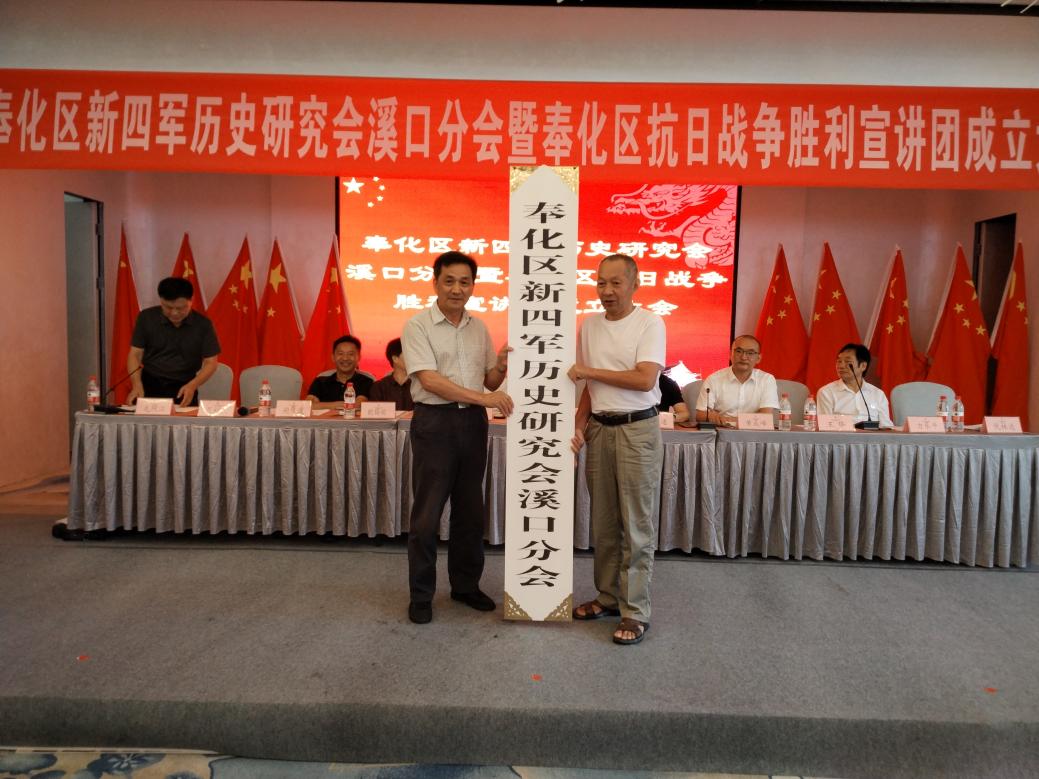 活動現場,宣布了奉化區新四軍歷史研究會溪口分會第一屆理事會名單,頒發分會牌匾與副會長單位銅牌,并為奉化區抗日戰爭勝利宣講團授旗。